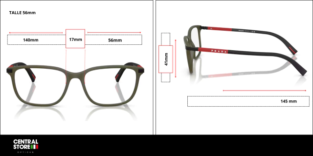 Dimensiones: 56mm Ancho / 41.0mm Altura / 17mm Puente / 145mm Patilla / 140.0mm Bisagra a Bisagra