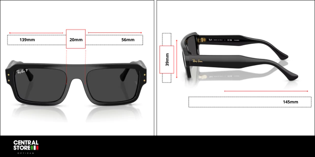 56mm Ancho del cristal / 39mm Altura del marco / 20mm Puente / 145mm Patilla / 139mm Bisagra a Bisagra