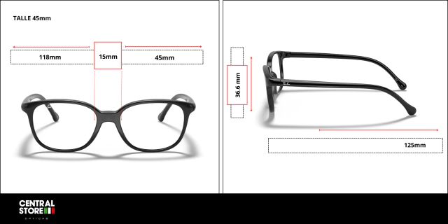 45mm Ancho del cristal / 346.6mm Altura /15mm Puente / 125mm Patilla / 118.0mm Bisagra a Bisagra