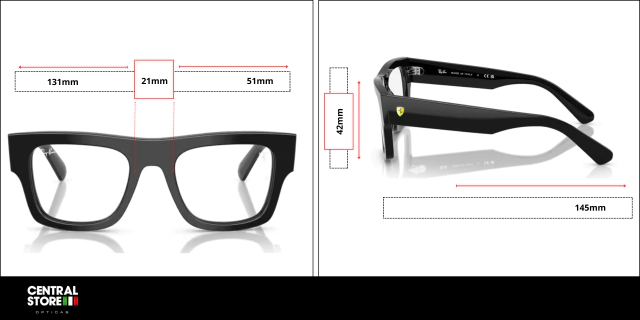 51mm Ancho del cristal / 42mm Altura del marco / 21mm Puente / 145mm Patilla / 131.0mm Bisagra a Bisagra